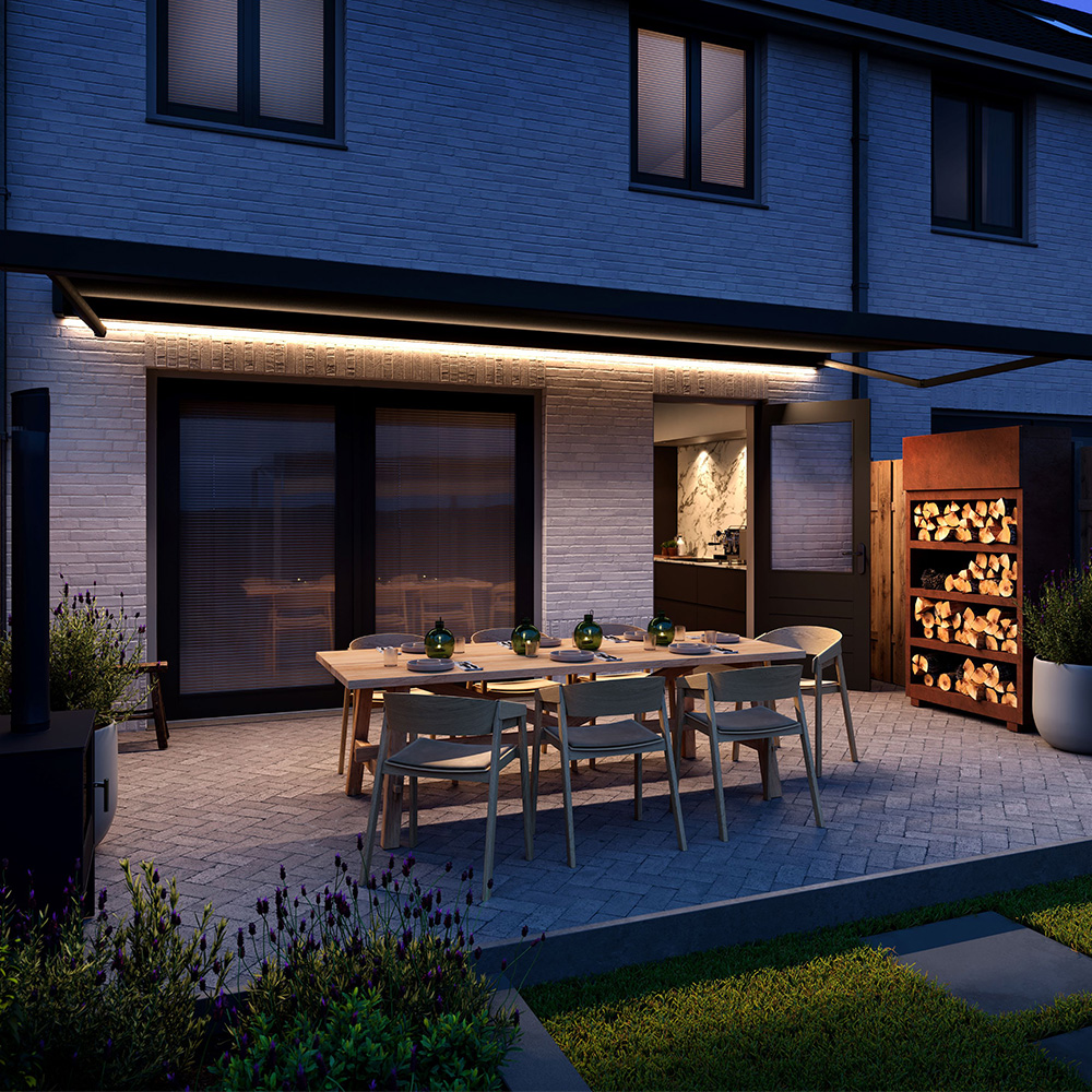 - Optionen: LED-Lichtschiene, Infrarot-Heizstrahler, Sonnen-, Wind- und Regensensoren