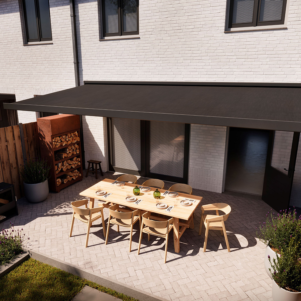 Das geschlossene Kassettengehäuse schützt Stoff und Technik vor Witterungseinflüssen und sorgt für eine lange Lebensdauer. Im eingefahrenen Zustand bleibt alles unsichtbar – für eine aufgeräumte Optik.