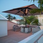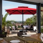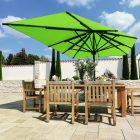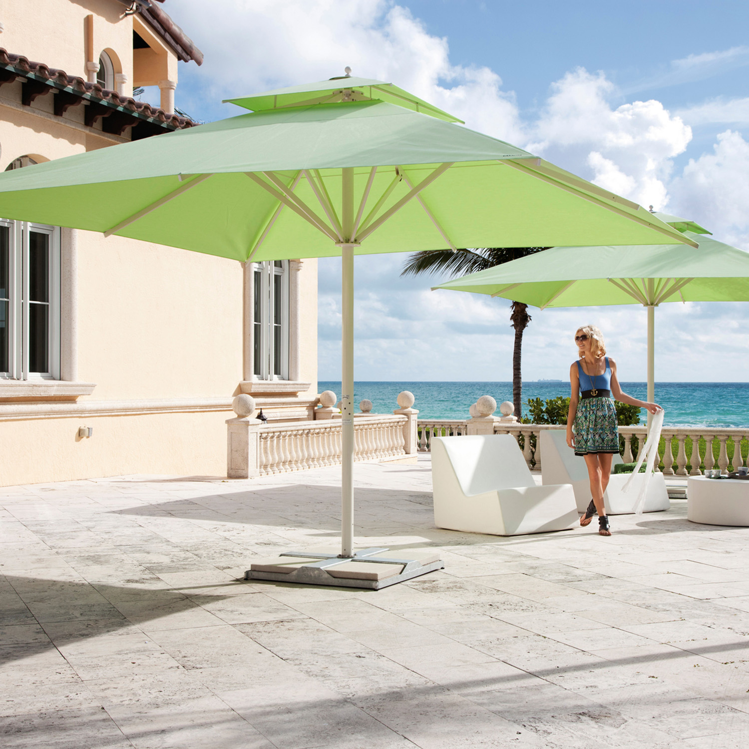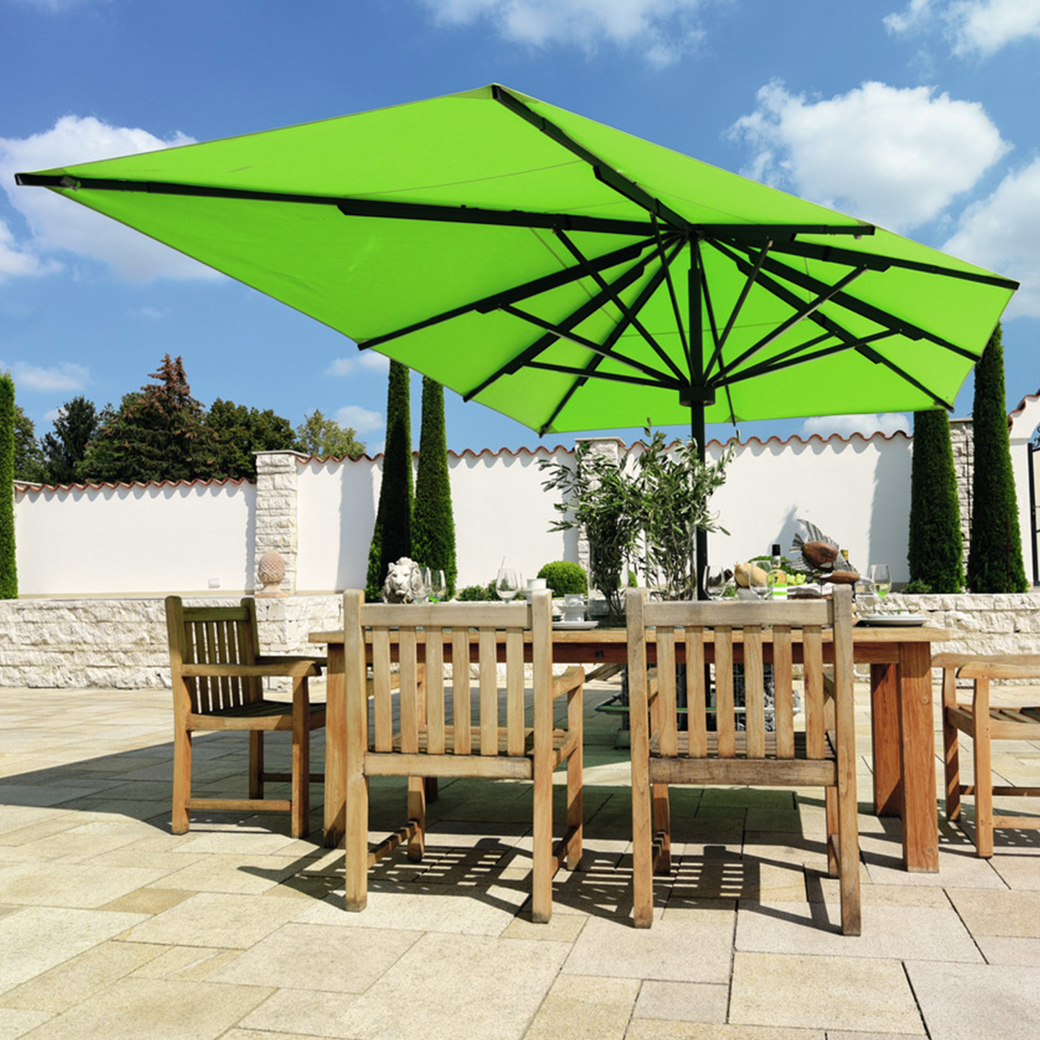 • Maximale Größe: Er ist als Großschirm konzipiert und bietet Spannweiten von bis zu 7 Metern, wodurch er riesige Flächen (bis zu 38 m²) effektiv beschatten kann.