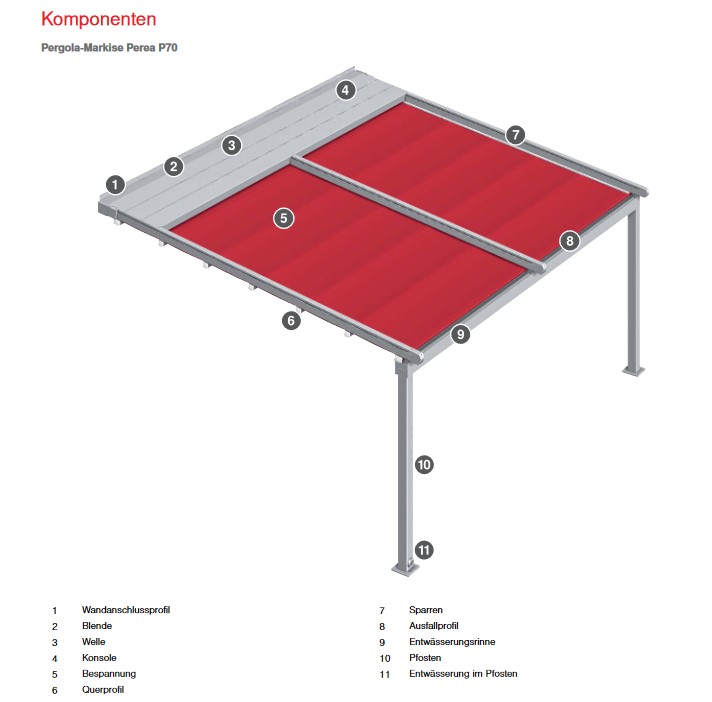 Die Pergola Markise P70 von Warema ist wetterfest und die innovative Falttechnik sorgt für ein extravagantes Markisen-Design. Transluzenter und regensicherer Stoff garantiert ein angenehmes Klima unter der Markise und das bei sehr hoher Windstabilität und kontrolliertem Regenablauf. Sie hat besonders viele Extras wie Vorbau-Markisen mit easyZIP-Führung zur senkrechten Verschattung oder GranTex mit easyZIP-Führung zur senkrechten Verschattung für großen Breiten. Auch LED, Heizstrahler und eine Seiten-Markise sind wählbar.